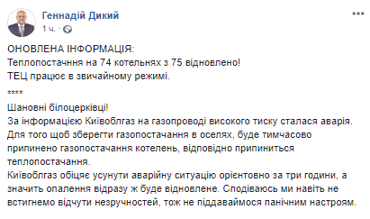 Около 12:15 Геннадий Дикий написал на своей странице в Facebook о том, что отопление в городе восстановлено.
