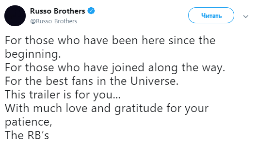 "Для тех, кто был с нами с самого начала. Для тех, кто присоединился в пути. Для лучших фанатов во Вселенной. Этот трейлер для вас. С большой любовью и благодарностью за терпение", - написали режиссеры картины Энтони и Джо Руссо в своем аккаунте в Twitter.