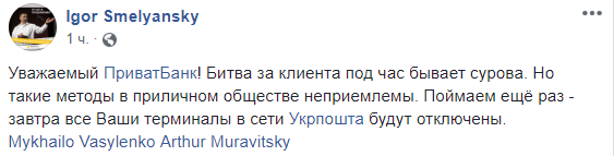 "Уважаемый ПриватБанк! Битва за клиента подчас бывает сурова. Но такие методы в приличном обществе неприемлемы. Поймаем еще раз - завтра все Ваши терминалы в сети "Укрпошты" будут отключены", - заявил он, прикрепив образец объявлений, которые стали появляться в области.