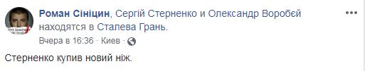 Экс-лидер одесского Правого сектора Сергей Стерненко, которого обвиняют в том, что он зарезал человека, сделал провокационную фотографию на фоне ножа. Об этом сообщил в Facebook волонтер Роман Синицын.