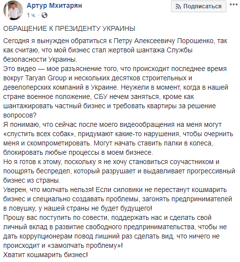 По его словам, СБУ использует грязные пиар технологии - разные медиа "сливные бачки" и соцсети для дискредитации компании Taryan Group. "Сегодня я вынужден обратиться к Петру Алексеевичу Порошенко, поскольку считаю, что мой бизнес стал жертвой шантажа Службы безопасности Украины. Уверен, что молчать нельзя! Если силовики не перестанут кошмарить бизнес и специально создавать проблемы, загонять предпринимателей в ловушку, в нашей страны не будет будущего!" - подчеркнул Мхитарян.