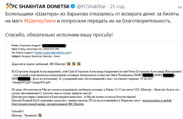 Болельщики Шахтера из Харькова отказались от возврата средств за игру с Лионом и попросили отдать деньги на благотворительность. Об этом преданные поклонники донецкой команды, семья Сторожевых, написала письмо в клуб, передает официальный Twitter "горняков".