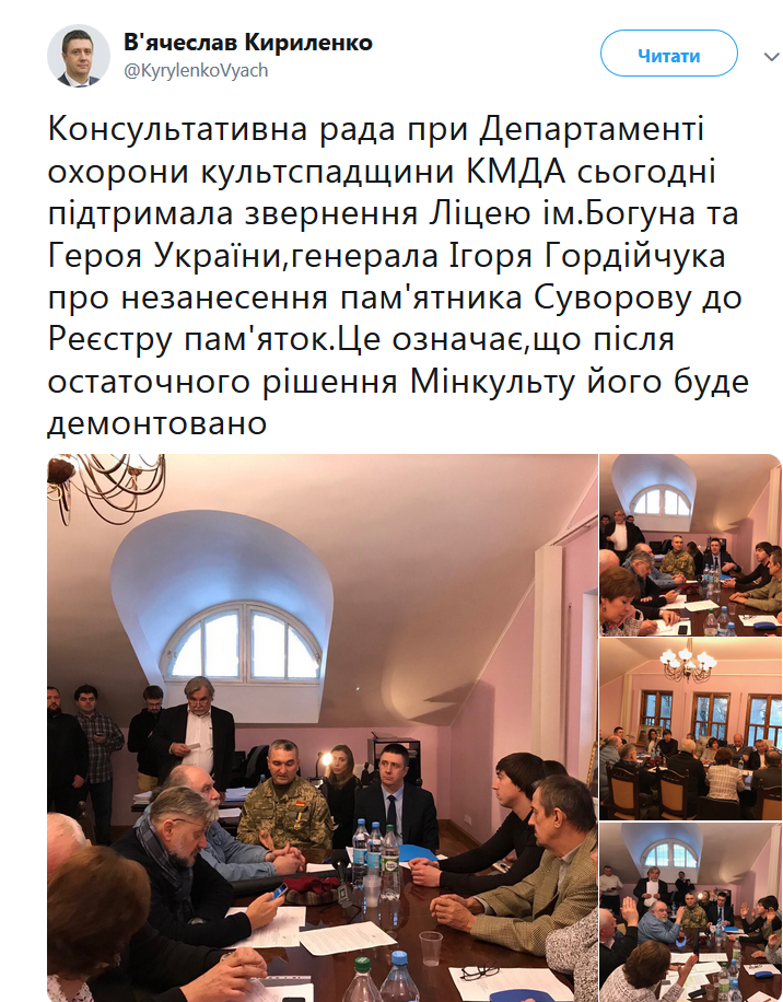 "Консультативный совет при Департаменте охраны культурного наследия Киевгосгорадминистрации сегодня поддержал обращение лицея имени Богуна и Героя Украины, генерала Игоря Гордийчука о незанесении памятника Суворову в реестр памятников. Это означает, что после окончательного решения Минкульта он будут демонтирован", - написал чиновник.