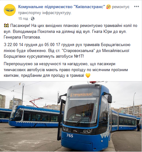 "Просим прощения за неудобства и напоминаем, что пассажиры временных автобусов имеют право проезда по месячным проездным билетам, приобретенным для проезда в трамвае", - уточнили в пресс-службе "Киевпасстранса".