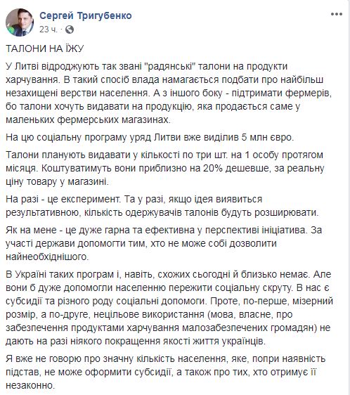 Возвращение талонов на еду для малообеспеченных, как это сделали в Литве, может стать в Украине инструментом поддержки бедных и фермеров. Такое мнение высказал нардеп от БПП Сергей Трегубенко в Facebook.