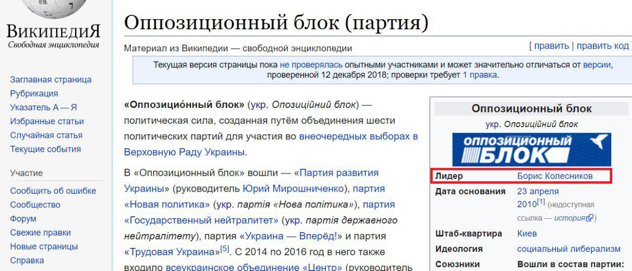 В качестве оного указан Борис Колесников (на самом деле он сейчас занимает пост сопредседателя партии, еще одним сопредседателем является Юрий Бойко). Соответствующая правка на сайте была сделана 13 декабря.