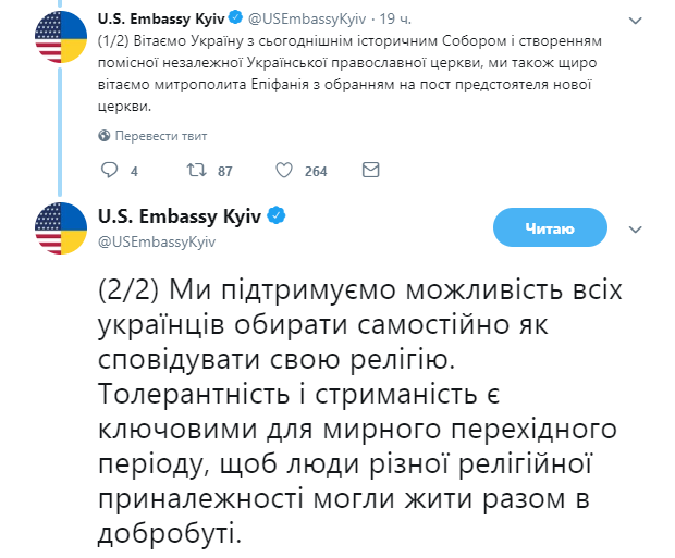 Посольство США в Украине поздравило нашу страну с созданием Поместной Церкви. Об этом сообщает официальный Twitter посольства.
