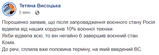 17:40  "Порошенко заявил, что после введения военного положения Россия отвела от наших границ 10% военной техники.