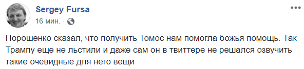 17:43  "Порошенко сказал, что получить Томос нам помогла божья помощь. Так Трампу еще не льстили и даже сам он в твиттере не решался озвучить такие очевидные для него вещи", - иронизирует блогер Сергей Фурса.