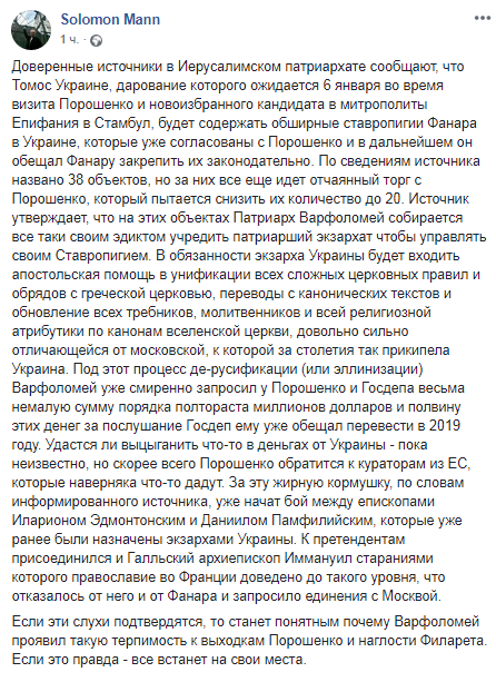 "Под этот процесс де-русификации (или эллинизации) Варфоломей уже смиренно запросил у Порошенко и Госдепа весьма немалую сумму порядка полтораста миллионов долларов и половину этих денег за послушание Госдеп ему уже обещал перевести в 2019 году. Удастся ли выцыганить что-то в деньгах от Украины - пока неизвестно, но скорее всего Порошенко обратится к кураторам из ЕС, которые наверняка что-то дадут", - пишет Манн.