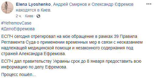 "ЕСПЧ сегодня отрегировал на мое обращение в рамках 39 Правила Регламента Суда о применении временных мер в связи с неоказанием надлежащей медицинской помощи и незаконного содержания под стражей Александра Ефремова. ЕСПЧ дал правительству Украины срок до 8 января предоставить всю информацию по делу Ефремова. Процесс пошел", - написала Лешенко.