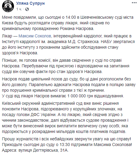 Глава Минздрава Ульяна Супрун сообщила, что сегодня, 19 декабря, в 14:00 в Шевченковском райсуде Киева будет рассматриваться дело врача, свидетельствующего по уголовному производству Романа Насирова. Об этом она сообщила в Facebook.