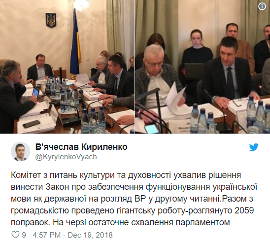 В профильном комитете одобрили проект тотальной украинизации, рассмотрев 2059 поправок