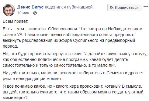 По данным Дениса Бигуса, завтра, 20 декабря, на заседании Наблюдательного совета телеканала "некоторые члены Наблюдательного совета предложат выкинуть расследования из эфира Общественного на предвыборный период".