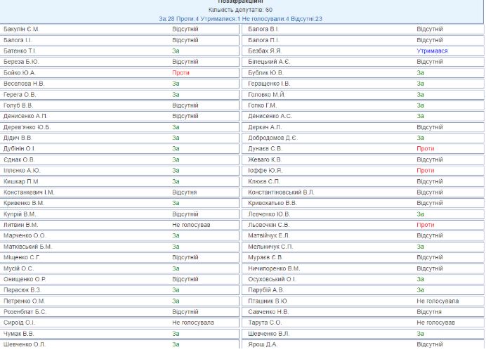 Единогласно "за", за исключением нескольких отсутствовавших, проголосовали Блок Петра Порошенко, Народный фронт, Самопомощь и Радикальная партия.