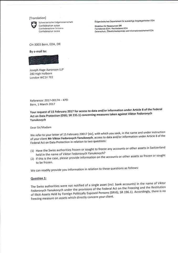 "(1) в Швейцарии нет банковских счетов или других активов на имя Президента Януковича, которые они заморозили (как и утверждает всегда сам Президент Янукович); а также