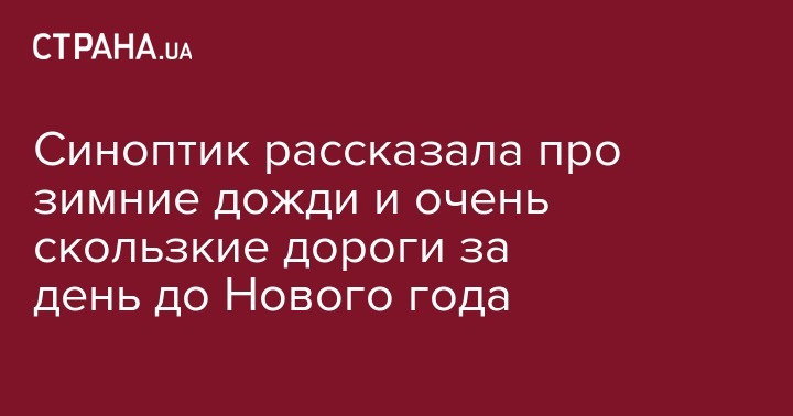 В воскресенье, 30 декабря, в Украине будет преобладать влажная погода, синоптики обещают периодические дождь со снегом и скользкие дороги. Температура воздуха ночью опуститься до 6 градусов мороза. Днем ​​ожидается около 0...-3 градусов мороза. Об этом сообщает синоптик Наталья Диденко в Facebook.