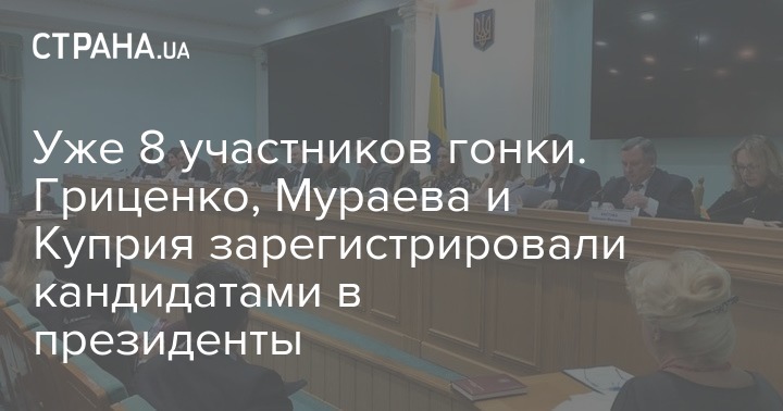 Лидера партии "Гражданская позиция" Анатолия Гриценко, лидера партии "Наши" Евгения Мураева и внефракционного народного депутата Виталия Куприя ЦИК зарегистрировала кандидатами в президенты Украины, сообщает комиссия.