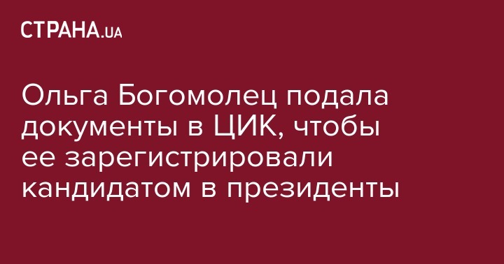 Ольга Богомолец подала документы в среду, 16 января, утром. Она баллотируется в порядке самовыдвижения. ЦИК должна зарегистрировать ее или отказать в регистрации в течение 5 дней.
