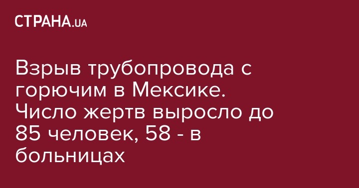 В Мексике произошла страшная авария на трубопроводе с горючим, которая привела к многочисленным человеческим жертвам. По состоянию на вечер 20 января, число жертв взрыва и пожара на трубопроводе в штате Идальго уже достигло 85 человек. Об этом заявил на пресс-конференции министр здравоохранения Мексики Хорхе Алькосер, передает ТАСС.