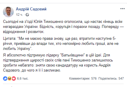 Андрей Садовой упомянул слова Тимошенко, о том, что коррупция и бедность должны остаться позади, а также о том, что нужно "не потерять следующее 5-летие, приведя к власти тех, кто непомерно любит деньги, но не любит Украину".