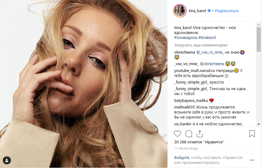"Одиночество иногда необходимо, чтобы понять этот окружающий тебя мир", "Творчество любит одиночество", "А наше вдохновение - Вы", "Идеальная женщина", "Невероятно красивая! Мое вдохновение", "Весь наш мир и есть одиночество, что дает нам много сил...", "Ты не одинока, рядом всегда очень много красивых и талантливых людей помогающих в творчестве. Есть сын, а это будущий мужчина, который будет любить тебя всегда. Армия твоих поклонников постоянно умножается. Так и должно быть у лучшей певицы страны", "В этом мире есть что-то лучше? Красивее? Мне кажется Нет!", "Вау, какая няшечка и нежная такая", "А может, стоит позволить сердцу опять полюбить", "Вселенная в Ваших глазах, Тиночка, Вы невероятная. Мы безгранично любим Вас", "Это вы нашла Богиня и наше вдохновение. Идеальные фотографии, спасибо вам, что вдохновляете", "Шикарная! Схожу с ума", - пишут ее фолловеры.
