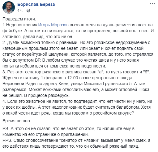 Вызов сделал российский сенатор Игорь Морозов у себя в Facebook, заявив о намерении получить сатисфакцию за оскорбление телеведущей. Береза принял вызов и предложил встретиться у здания Верховной Рады.