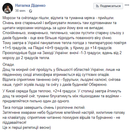 "Такая погода завершит январь и начнет февраль. Затянутое облаками небо будет будить элегическое настроение, клонить голову на клавиатуру, способствовать чтению мрачных стихов и ворчанию - не поддавайтесь! Это же первые репетиции весны", - написала Наталья Диденко.