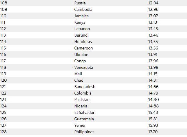 Украина оказалась на 116 строчке глобального рейтинга безопасности стран по версии американского издания Global Finance. Всего в исследовании приняли участие 128 государств. Об этом сообщает ubr.ua со ссылкой на рейтинг.