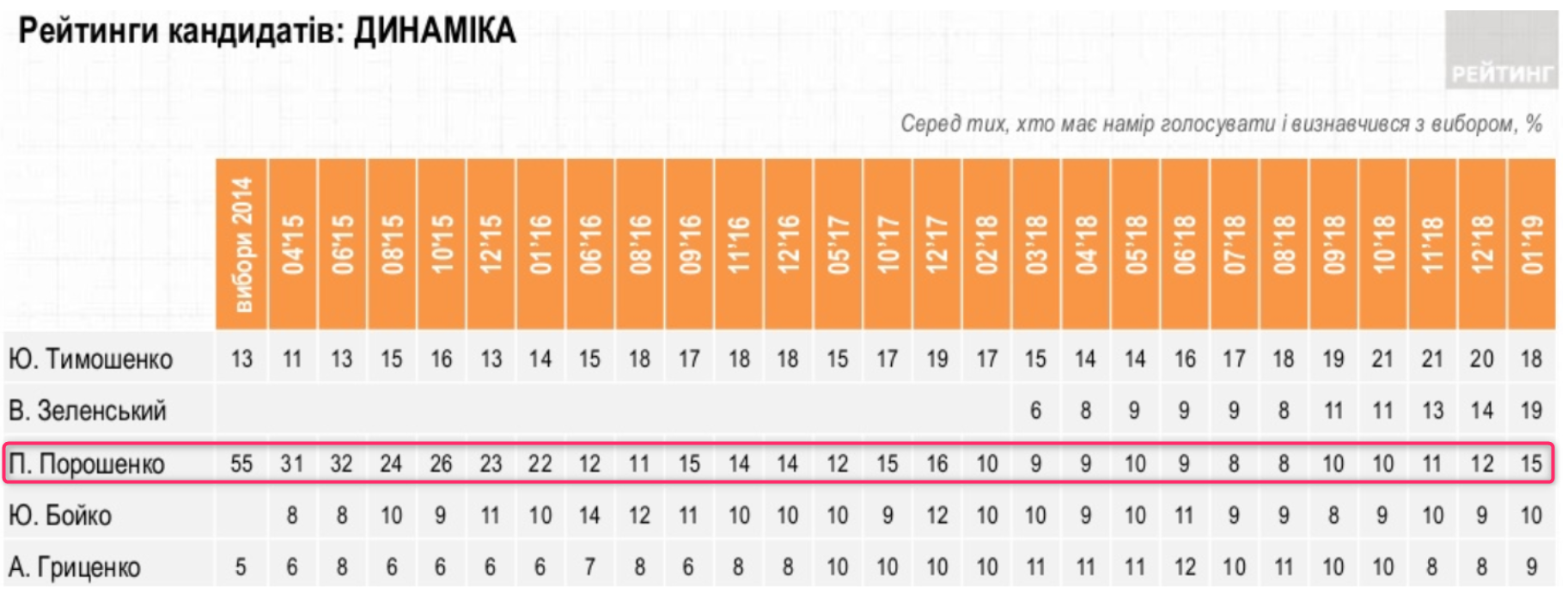 Второй важный тренд рейтингов – это прирост у Петра Порошенко. "Рейтинг" дает ему 15,1% и третье место, а "Социс", КМИС и Центр Разумкова – 16,4% со вторым, после Зеленского, местом.