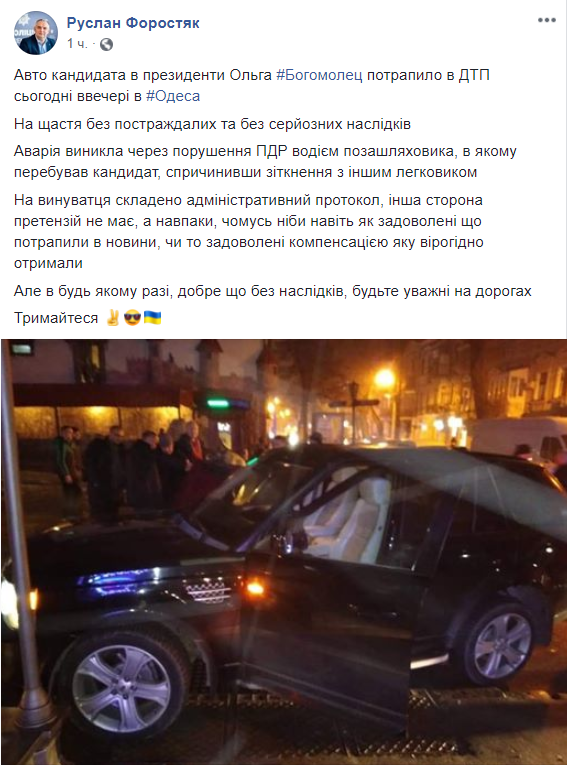 "Авто кандидата в президенты Ольги Богомолец попало в ДТП сегодня вечером в Одессе. К счастью без пострадавших и без серьезных последствий", – написал он на своей странице в Фейсбук в пятницу вечером.