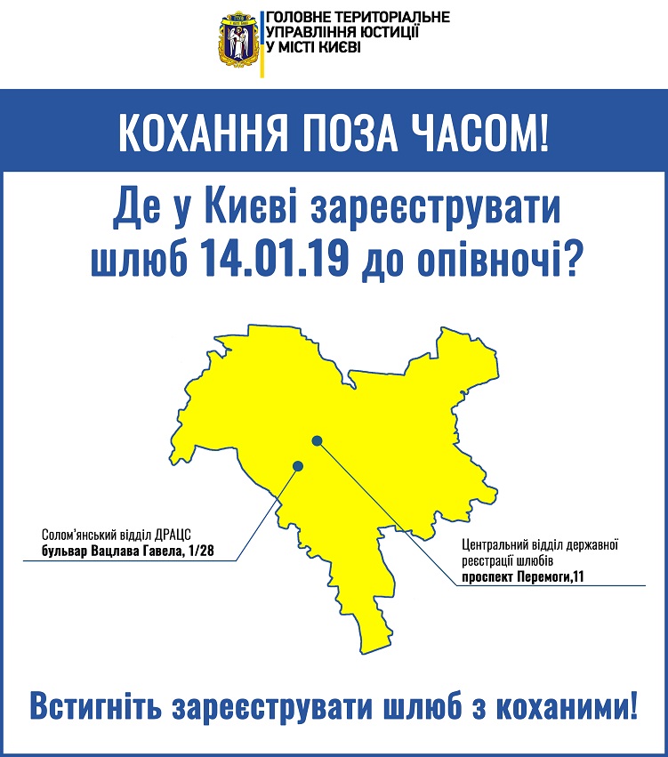 14 февраля, в День святого Валентина, Центральный отдел государственной регистрации браков (проспект Победы, 11) и Соломенский отдел ЗАГС (бульвар Вацлава Гавела, 1/28) будут регистрировать браки в продленном режиме. Об этом сообщает пресс-служба Главного территориального управления юстиции в городе Киеве.