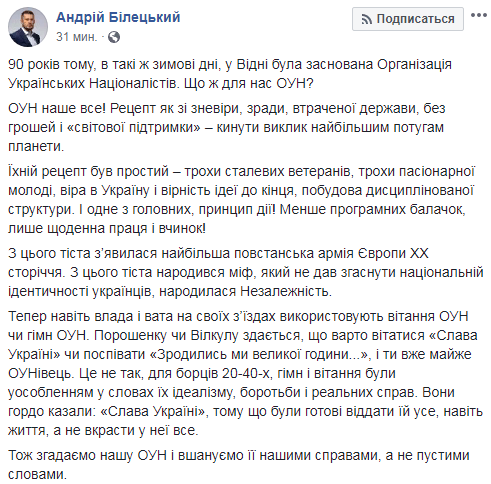 "ОУН наше все!", - говорится на Фейсбук-странице главаря "Азова". Билецкий также решил предположить, каким был "рецепт" ОУН.