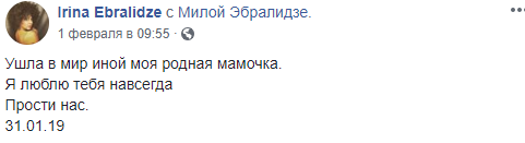 О погибшей в ДТП Эбралидзе известно, что она жительница Одессы. Дочь Людмилы Ирина опубликовала трогательный пост в Facebook: "Ушла в мир иной моя родная мамочка. Я люблю тебя навсегда. Прости нас".
