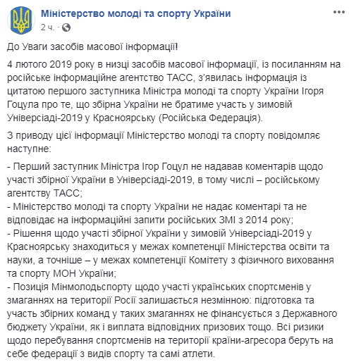 "Первый заместитель министра Игорь Гоцул не давал (никакого - прим. ред.) комментариев по участию сборной Украины в Универсиаде-2019, в том числе – российскому агентству ТАСС", - об этом говорится на Фейсбук-странице ведомства.