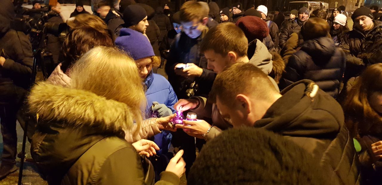 На месте присутствует полиция диалога. Мероприятие началось с минуты молчания, были зажжены свечи.