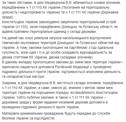 Таким образом, в ГПУ пришли к выводу, что в действиях Медведчука усматриваются признаки преступлений, предусмотренных ч.1 ст.110 УК Украины (посягательство на территориальную целостность и неприкосновенность Украины) и ч.1 ст.111 УК Украины (государственная измена). Материалы уголовных производств будут переданы в Службу безопасности Украины по подследственности.