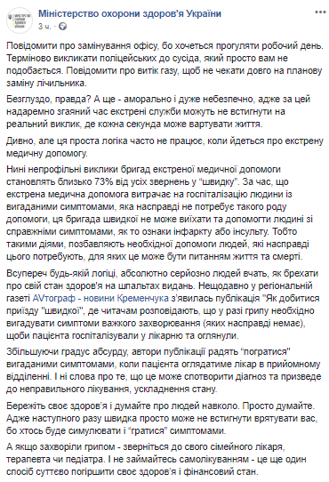 "Вопреки любой логике, абсолютно серьезно людей учат, как врать о своем состоянии здоровья на страницах изданий. Недавно в региональной газете "AVтограф - новости Кременчуга" появилась публикация "Как добиться приезда скорой", где читателям рассказывают, что в случае гриппа необходимо выдумывать симптомы тяжелого заболевания (которых на самом деле нет), чтобы пациента госпитализировали в больницу и осмотрели", - говорится в сообщении.