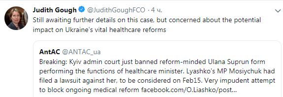 Посол Великобритании в Украине Джудит Гоф обеспокоена возможным влиянием решения суда об отстранении от должности и.о. министра здравоохранения Украины Ульяны Супрун на реформу здравоохранения. Об этом посол написала на своей странице в микроблоге Twitter во вторник.