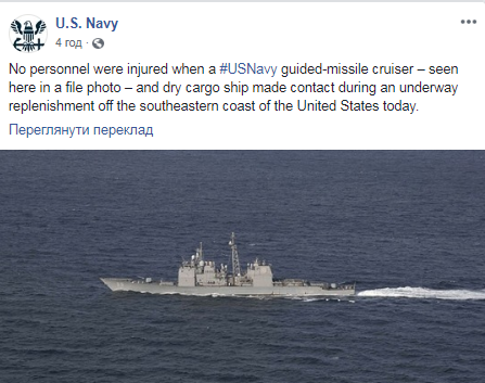 "Никто из личного состава не пострадал, когда ракетный крейсер US Navy и сухогруз, столкнулись во время операции разгрузки-погрузки у юго-восточного побережья Соединенных Штатов", - заявили в морском ведомстве.