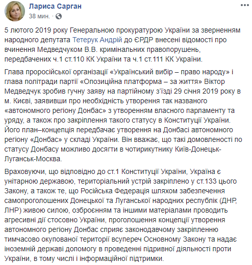 "Виктор Медведчук сделал громкое заявление на партийном съезде 29 января 2019 в Киеве, заявив о необходимости образования так называемого" автономного региона Донбасс "с образованием собственного парламента и правительства, а также о закреплении такого статуса в Конституции Украины", - написала в Facebook пресс-секретарь генпрокурора Лариса Сарган.