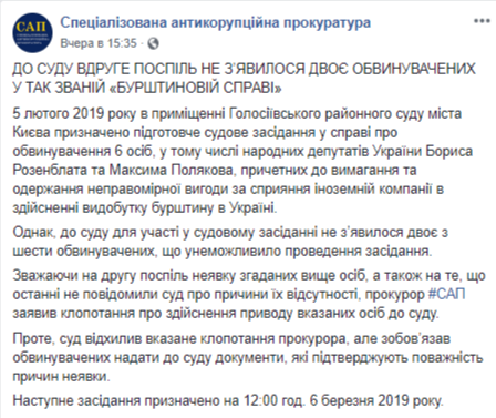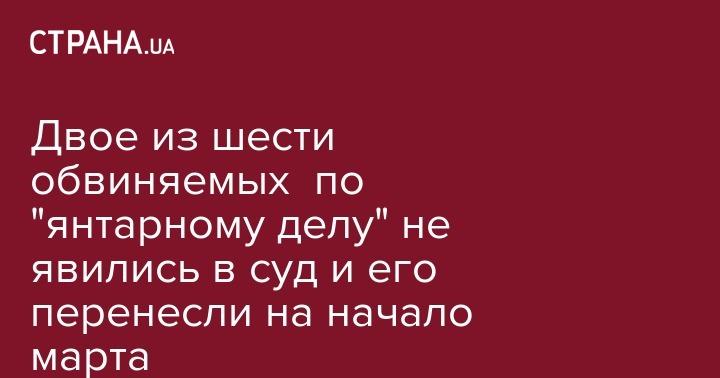 На странице в Facebook САП информирует, что подготовительное судебное заседание было назначено к рассмотрению 5 февраля, однако двое из шести обвиняемых, причастных к вымогательству и получению неправомерной выгоды за содействие иностранной компании в добыче янтаря в Украине, не явились.