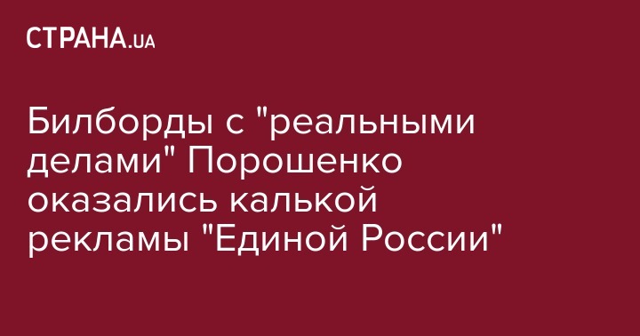 Слоганы предвыборых билдбордов Петра Порошенко "Реальные дела, а не пустые обещания" оказались калькой со слоганов пропутинской "Единой России". Это заметили пользователи социальных сетей.
