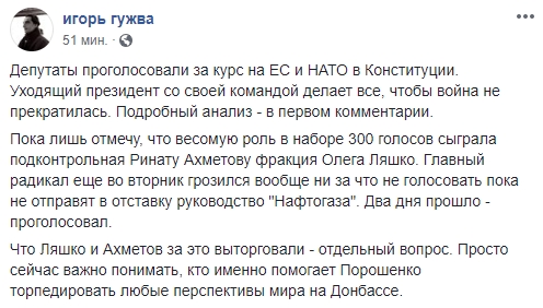 "Депутаты проголосовали за курс на ЕС и НАТО в Конституции. Уходящий президент со своей командой делает все, чтобы война не прекратилась. Пока лишь отмечу, что весомую роль в наборе 300 голосов сыграла подконтрольная Ринату Ахметову фракция Олега Ляшко. Главный радикал еще во вторник грозился вообще ни за что не голосовать пока не отправят в отставку руководство "Нафтогаза". Два дня прошло - проголосовал.