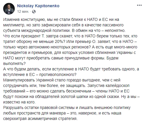Более того эти изменения дают права/ полномочия Президенту и парламенту двигаться в ЕС и НАТО, но не становясь обязанностью, и они в будущем могут быть отменены. А учитывая, что Конституция наполнена обязанностями исполнительных лиц, которые умышленно и давно игнорируются, эти изменения станут еще одними мертвыми положениями, не работающими на практике, но вызывающими конфликты и дискредитирующими основоположность главного документа Украины.