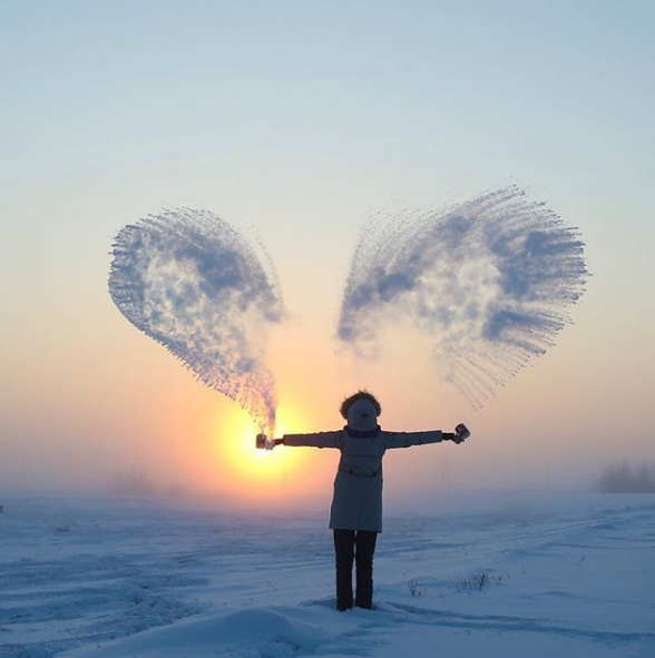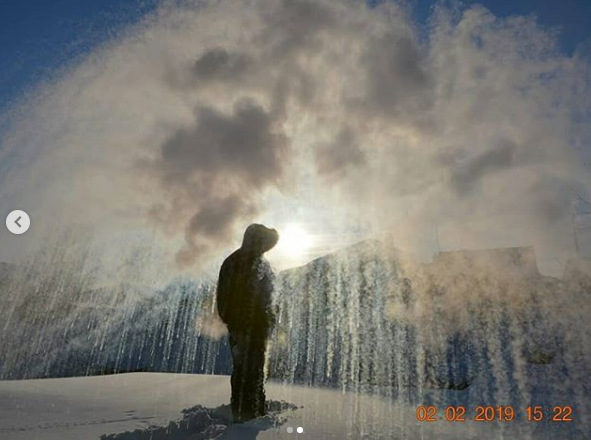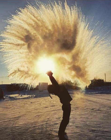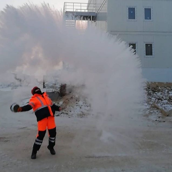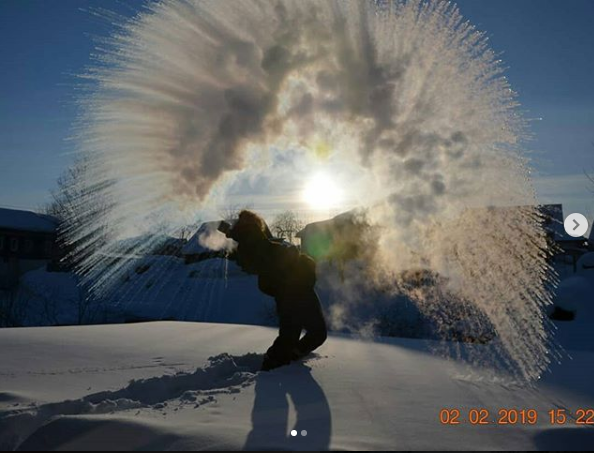 Жители областей, где настали такие холода, выкладывают фотографии и видеозаписи эксперимента, который можно провести с кипятком на морозе. Горячую воду разливают прямо в воздух, из-за резкого перепада температур образуется снег. Свои материалы с результатами такого эксперимента сибиряки подписывают в Instagram #дубакчеллендж.