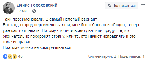 "Таки переименовали. В самый нелепый вариант. Вот когда город переименовывали, мне было больно и обидно, теперь уже как-то плевать. Потому что пути всего два: или придут те, кто окончательно похоронят страну, или те, кто начнет исправлять и это тоже исправят.