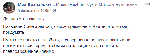"Давно хотел сказать. Название Сичеславская, самое дремучее и убогое, что можно придумать. Нужно не просто не любить, а совершенно не чувствовать и не понимать свой Город, чтобы желать нацепить на него это псевдоархаичное клеймо", - за пару дней до решения депутатов написал бизнесмен из Днепра Макс Бужанский.
