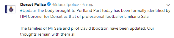 "Тело, доставленное в Портленд, было официально идентифицировано коронером Дорсета как тело профессионального футболиста Эмилиано Сала. Семьи г-на Салы и пилота Дэвида Ибботсона были оповещены. Наши мысли сейчас только о них", - заявили в пресс-службе полиции.