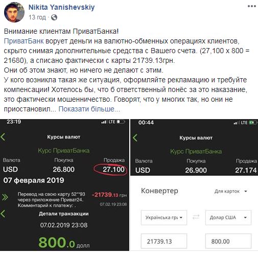"ПриватБанк ворует деньги на валютно-обменных операциях клиентов, скрыто снимая дополнительные средства с вашего счета. (27,100 х 800 = 21680) Они об этом знают, но ничего не делают с этим. У кого возникла такая же ситуация, оформляйте рекламацию и требуйте компенсации! Хотелось бы, что б ответственный понёс за это наказание, это фактически мошенничество. Говорят, что у многих так, но они не приостановили дальнейшую работу сервиса. Впервые за долгое время был изменён курс в ночное время, согласно архиву курса валют на главном сайте privatbank.ua (п. 2.1.1.16.4) договора и четко подогнан под курс до тысячной всех эти мошеннических дополнительных списаний у клиентов. Все скриншоты сделаны, так низко опускаться до таких действий банку вашего уровня", — пишет Янишевский.